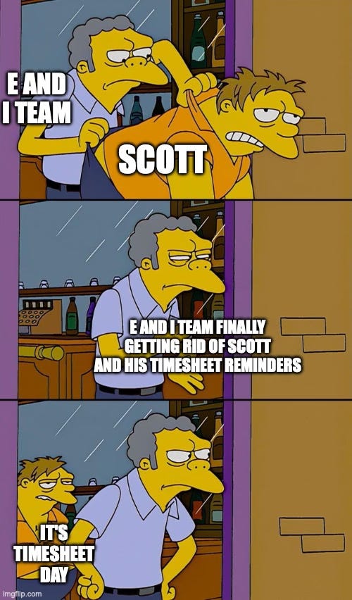 Behold, this week’s timesheet meme! For reference, my team was the “Emerging and Immersive” Tech team, which is why I call them E and I!
